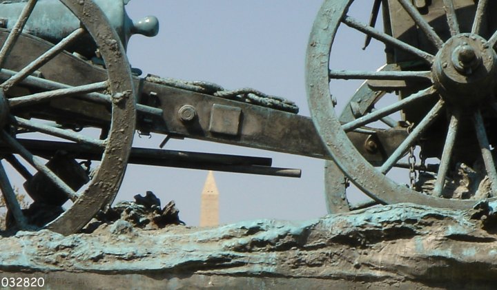 | The cannon carriage connected to the caisson (Washington monument in background). To help you keep it in perspective, click here for a view of the entire artillery group from the west and click here for a view from the east. |